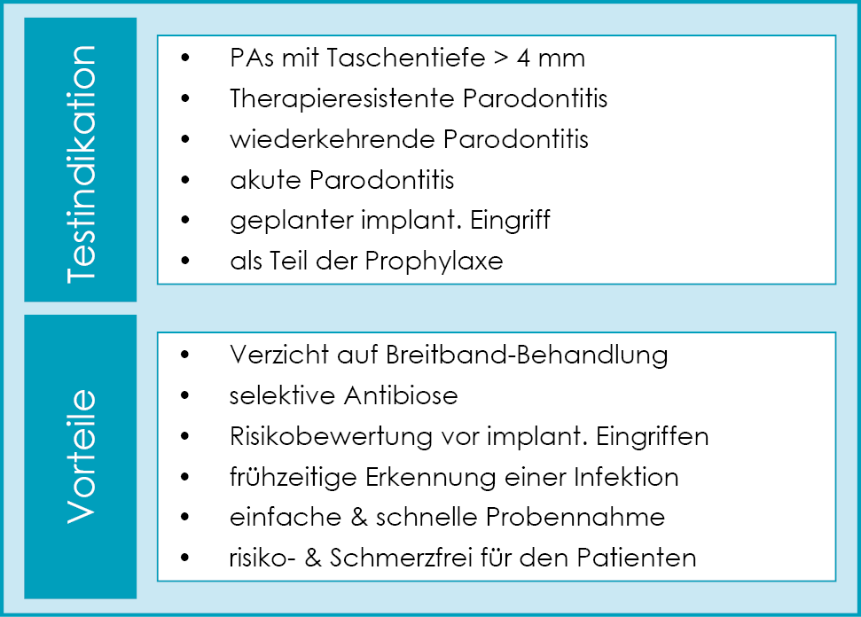 Periimplantitis bezeichnet eine Sonderform der Parodontitis, wenn die entzündliche Erkrankung des Zahnfleischs im Rahmen eines Zahnimplantats auftritt. In dem Fall kann die bakterielle Infektion des umliegenden Gewebes dafür sorgen, dass das Implantat nicht ordnungsgemäß einwächst oder sich nach erfolgreicher Implantation wieder lockert. Daher ist es für den Erfolg eines so großen und kostenintensiven Eingriffs von Vorteil und im besten Interesse des Patienten, die potentielle Keimbelastung vorher zu evaluieren und, falls indiziert, eine prophylaktische Therapie zu veranlassen.